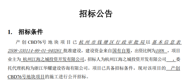 就在昨天,产创CBD76号地块项目就施工、监理进行了公开招标。